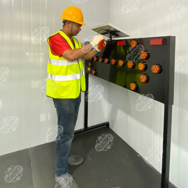 A solar-powered traffic control device that illuminates directional arrows, commonly used in road construction, maintenance, and temporary traffic direction. We offer customized solutions, including tailored frame designs, colors, LED screens, and solar panel sizes.